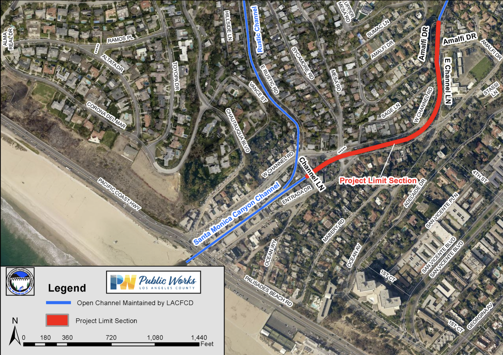 The cleanup will consist of breaking and removing loose and damaged concrete from the channel, then transporting the broken concrete to the dead-end cul-de-sac near Amalfi Dr. where an excavator will lift the concrete from the channel and load it into trucks for removal to a disposal site, according to an L.A. County Public Works information sheet.