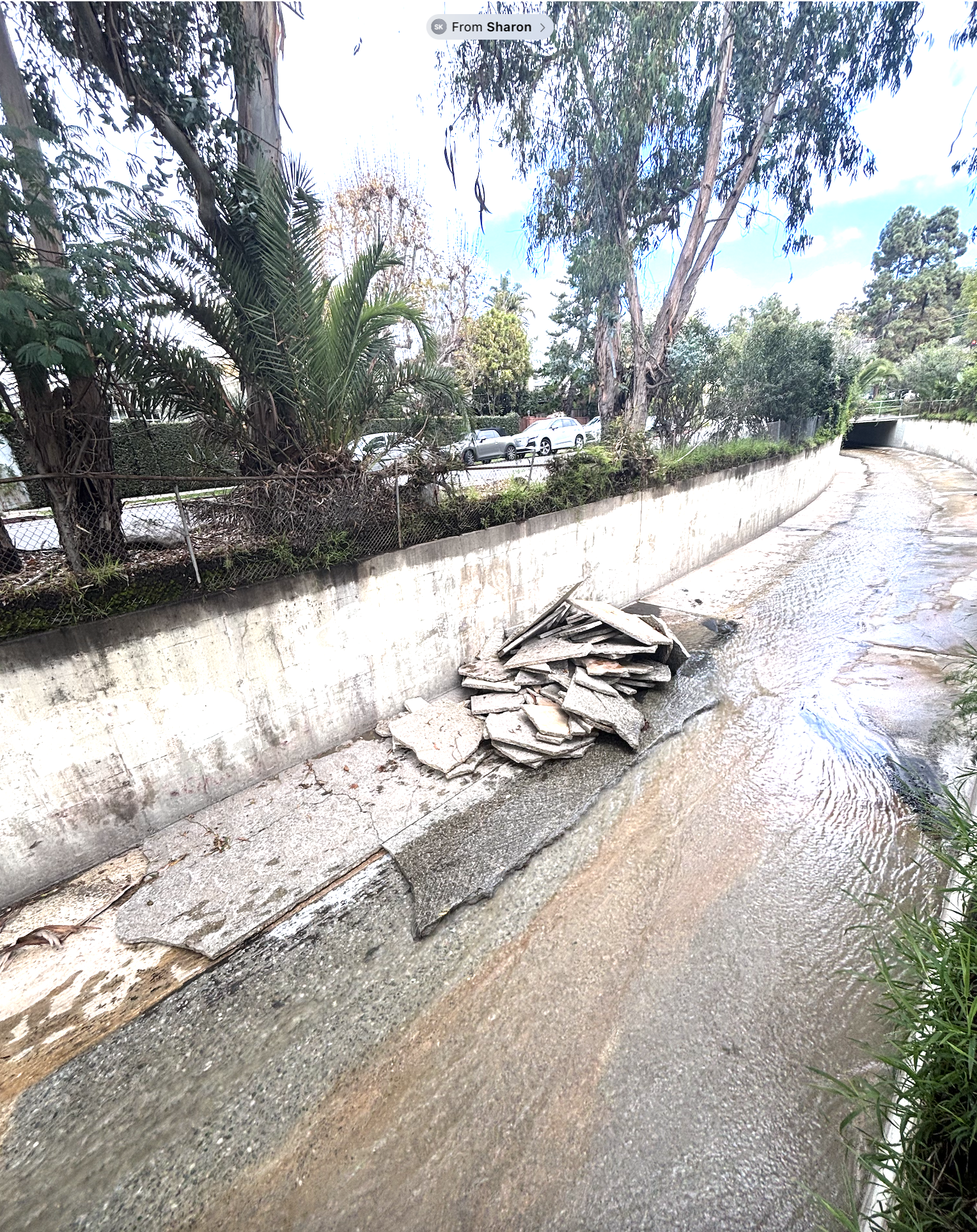 Kilbride, a board member of The Canyon Alliance and the Canyon representative to the Pacific Palisades Community Council, reached out to city officials, including Councilmember Traci Park’s office, and was told that L.A. County Public Works field engineers’ preliminary reports said that the channel’s concrete overlay, which was installed in the 1970s, had peeled off.