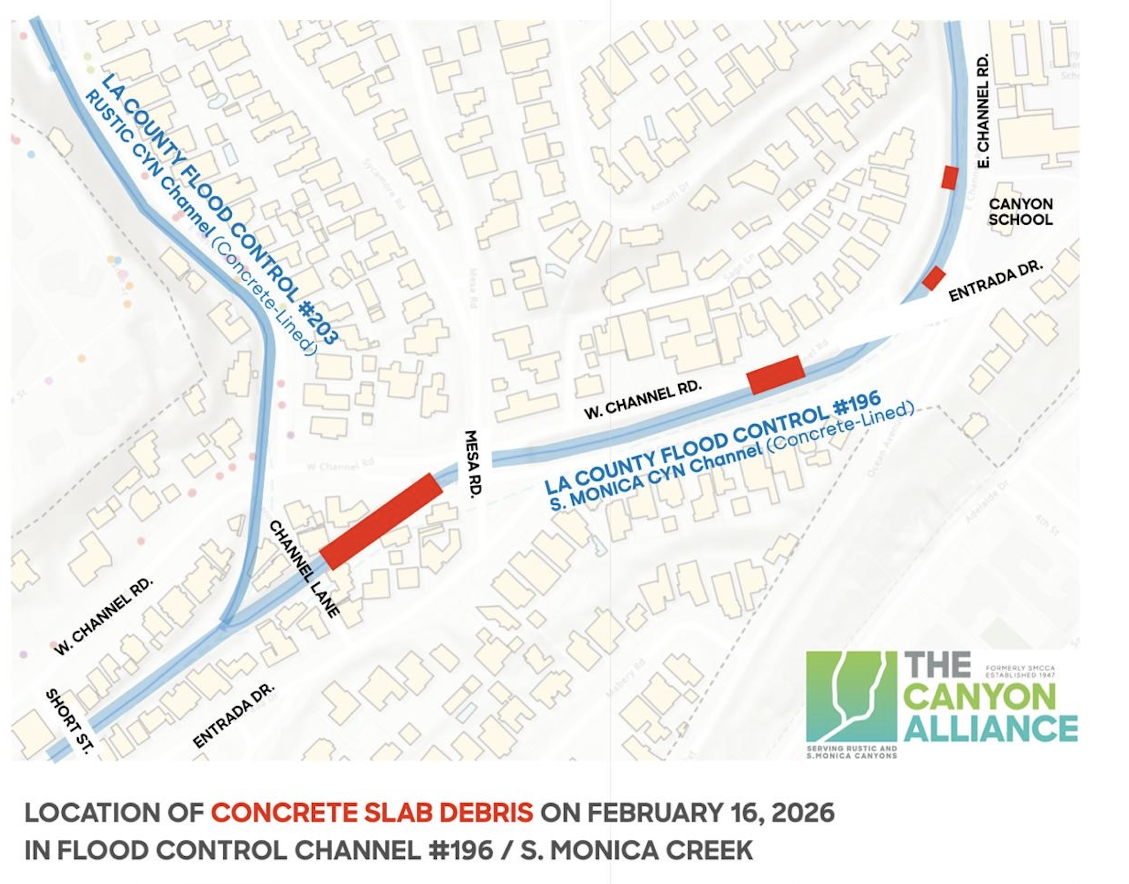 The Canyon Alliance Board Member Doug Suisman created this map of the Santa Monica Canyon Channel showing four locations where debris had accumulated in the channel.