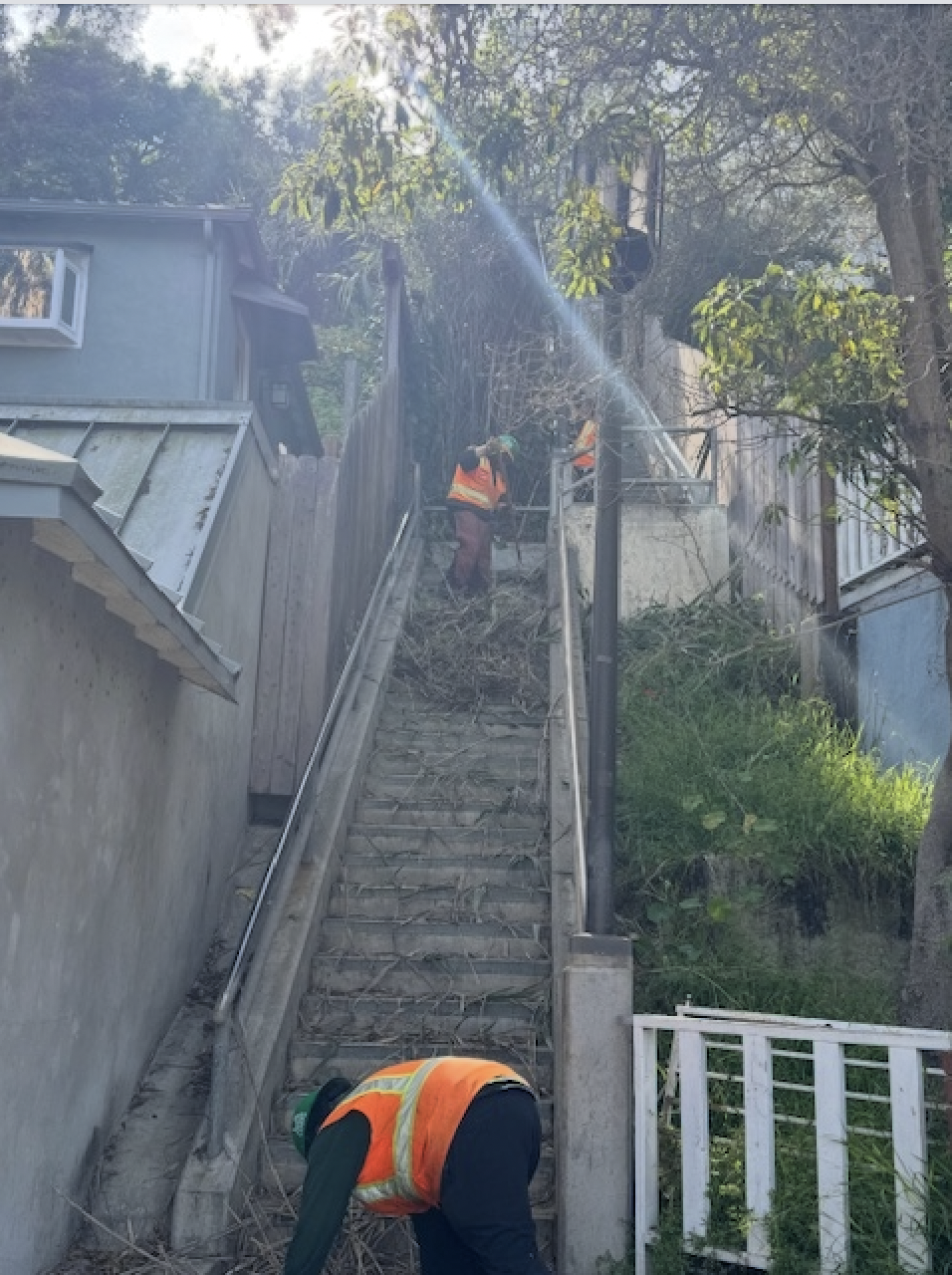 “After many complaints about the dried bamboo overhang on the Fourth Street staircase, today crews were there cleaning up,” Kilbride said.