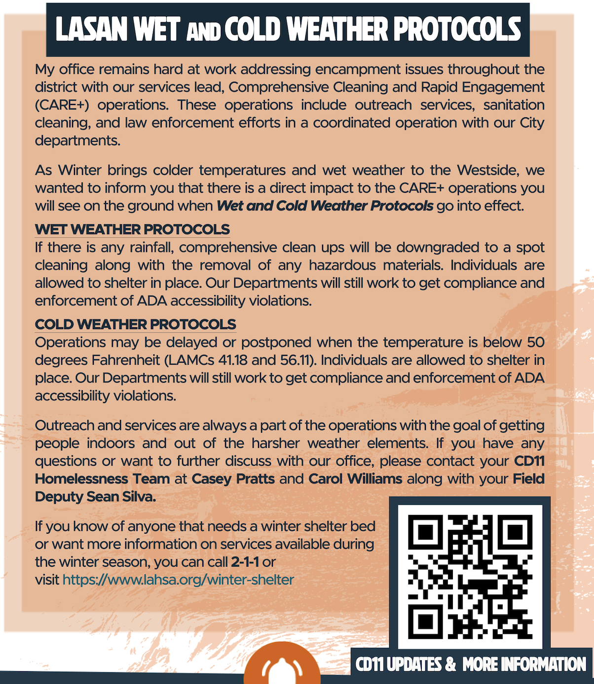 Park’s office also shared the below flyer about cold and wet weather protocols for unhoused populations.
