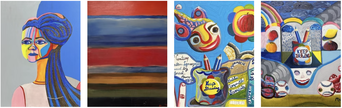 “What struck us most of all was the vibrancy, the joy, the love, the humor, the silliness and whimsy in the paintings,” his sister said on his webpage. “He transferred his inner darkness into vivid, life-affirming colors with passion and energy…. Going through the work, curating, organizing, and categorizing has been very sad and very joyful. It has been incredibly healing during the grieving. We wanted to do for him what he couldn’t do for himself. We want to let the world see the creative power and beauty that was in Maury’s soul.”