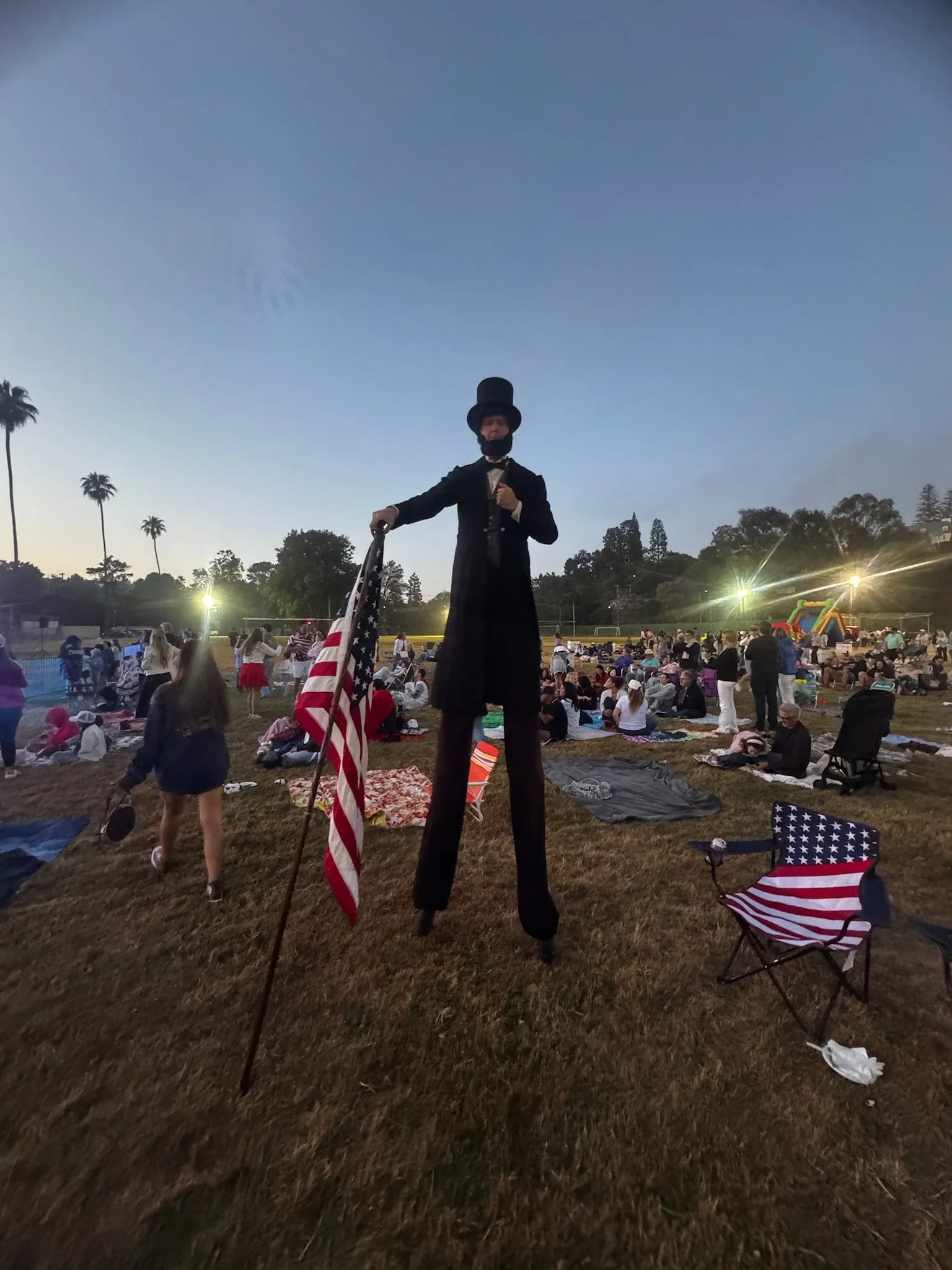 Fun was in the air as kids cavorted in the inflatables, snacked on food from the numerous trucks, and ran around with friends. “Uncle Sam” walked through the crowd on stilts as he normally does in the parade. The PaliHi band played a trio of tunes, then local artist and UCLA student Matty Gottesman led a band of fellow students in playing a snappy, vibrant mix of originals and cover tunes that got members of the crowd dancing.