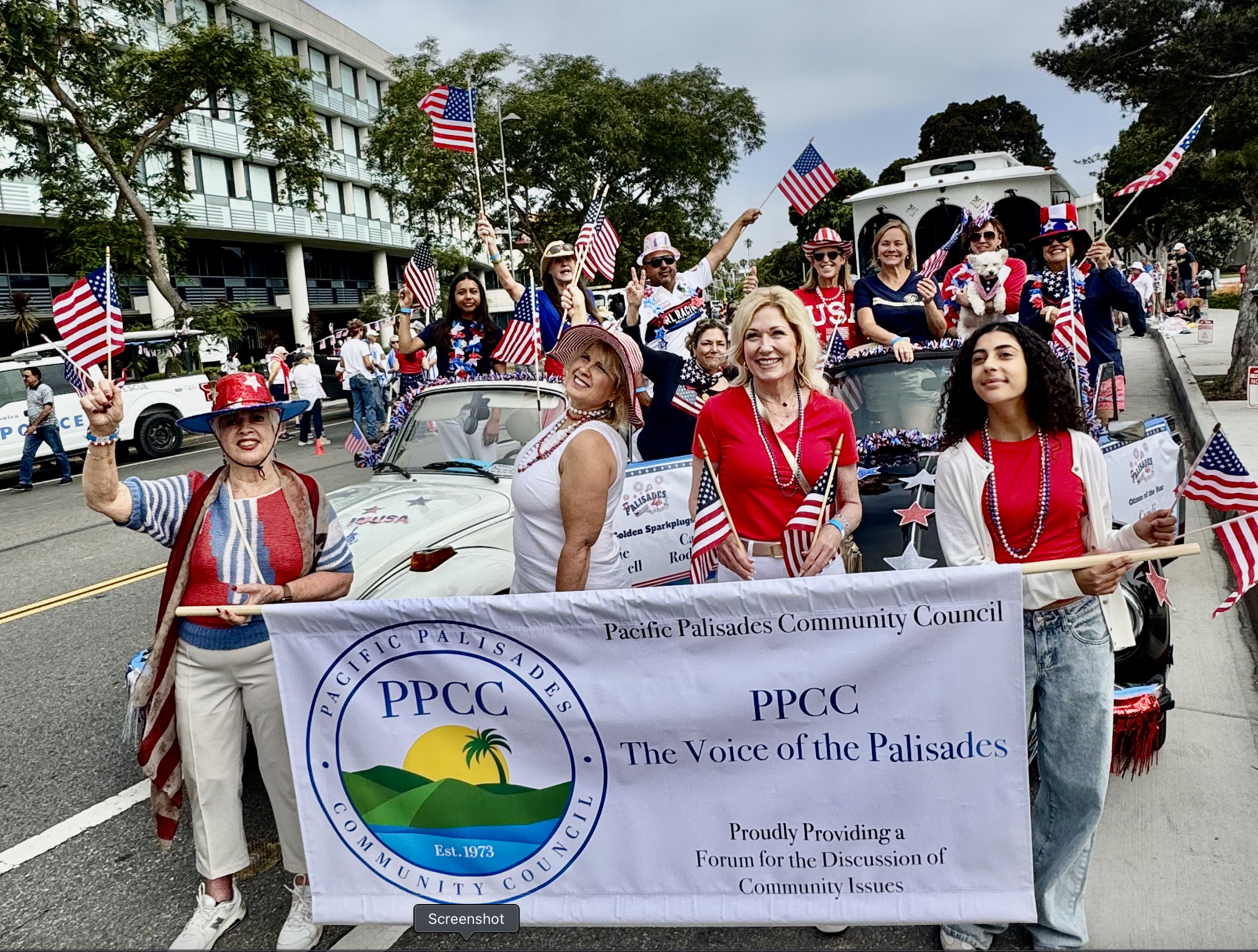 PPCC board members, Karen Ridgley, Diana Daniele, Julia Nielsen, and youth representative Ella Nozar, carry their banner in the Santa Monica Parade. Behind them are (from left to right) Cassandra Rodriguez, Sparkplugs Leslie Campbell and Carlos Rodriguez, S.M. Canyon resident Amy Hopper, PPCC President Sue Kohl, City Councilwoman Traci Park, Citizen of the Year Cindi Young, and Canyon PPCC representative Sharon Kilbride.