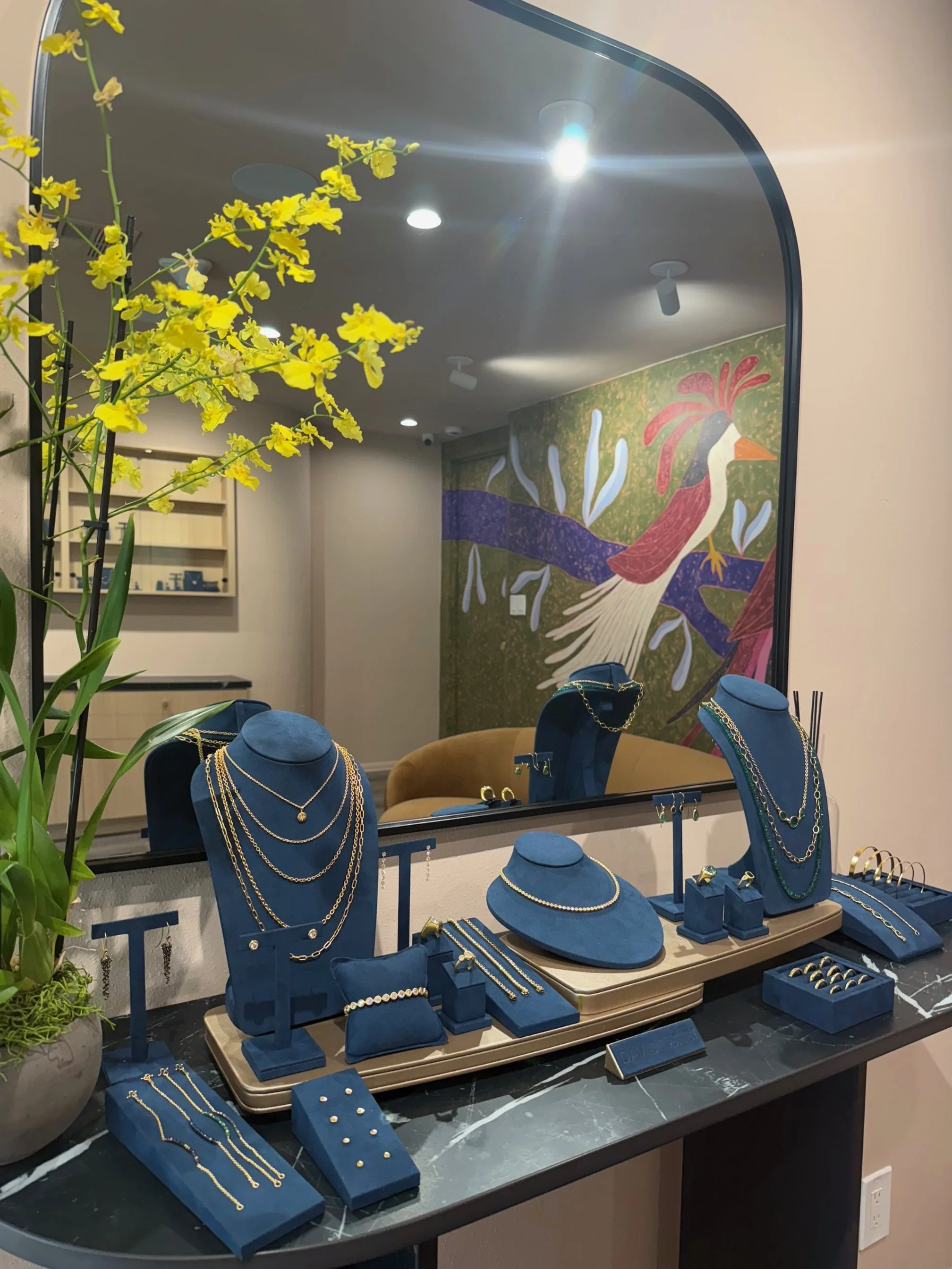 Now Rustic Canyon residents, the two have been working to reopen David Tishbi Jewelry, which specializes in high-end, 22-karat-gold, custom-made pieces. After searching for a new location, the couple found a second-story space at 632 Montana in Santa Monica, and Surya, a designer, crafted an interior that features a curving tan couch, a colorful mural of three huge, stylized birds, and a large mirror with jewelry displayed before it.
