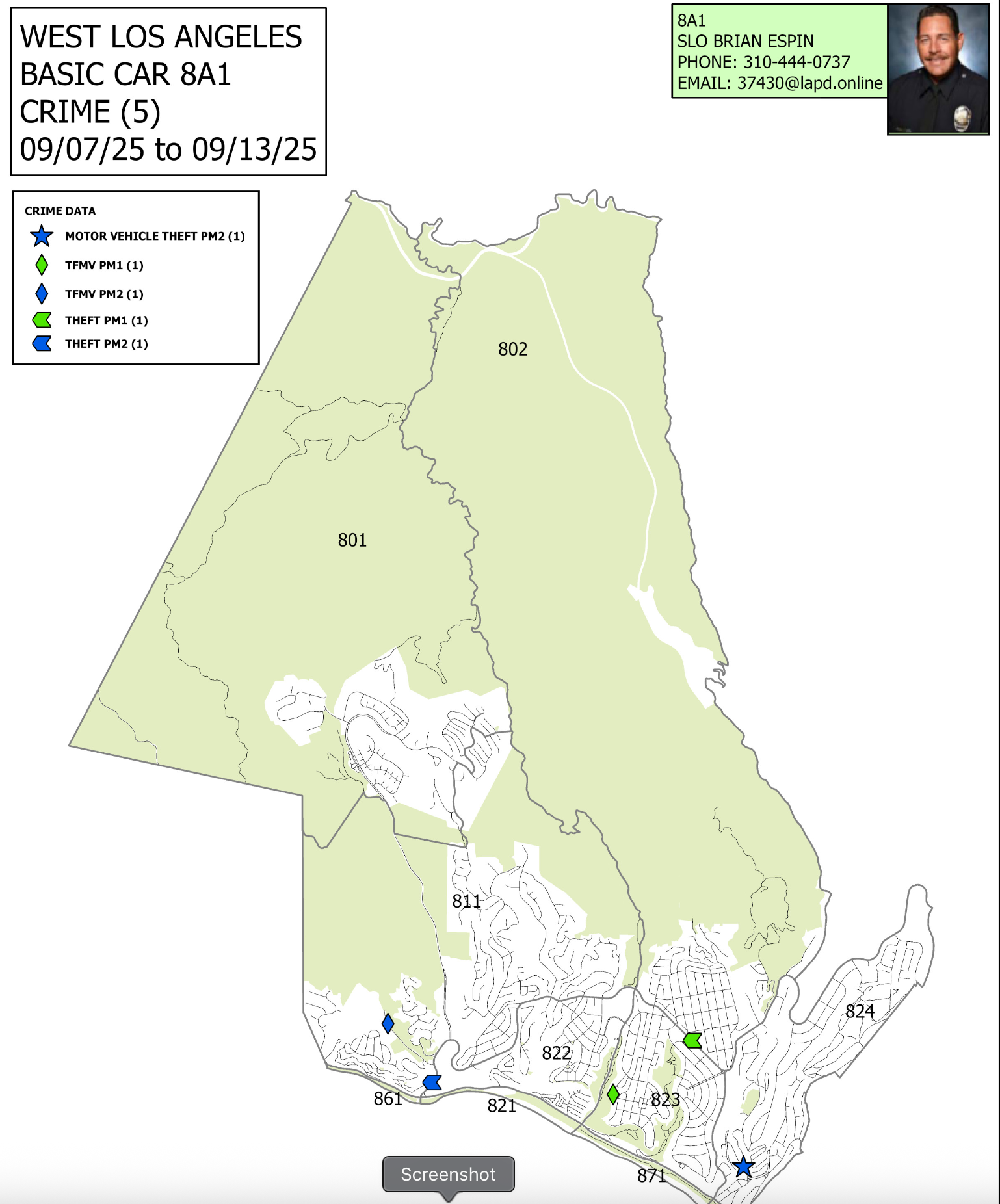 Thefts of packages and license plates in Pacific Palisades rose slightly last week, according to Brian Espin, the L.A.P.D. senior lead officer for the Palisades.