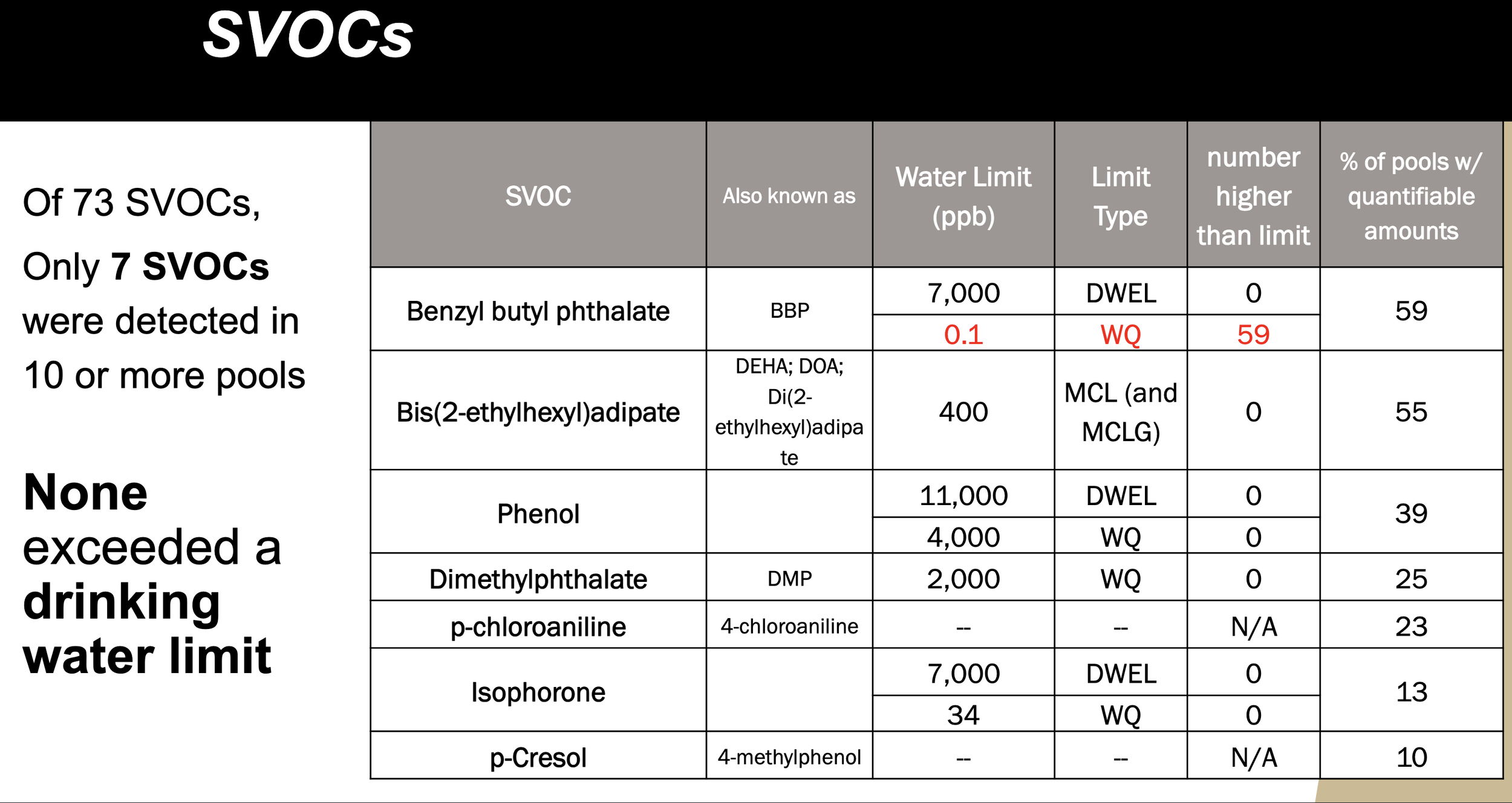 Seven of the 73 tested SVOCs were detected in 10 or more pools, but none exceeded drink water standards, according to the webinar.